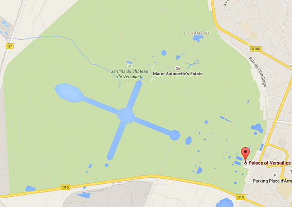 我們從Google Maps的圖來看,宮殿是紅點所在的位置,其他綠色的地方都是花園…