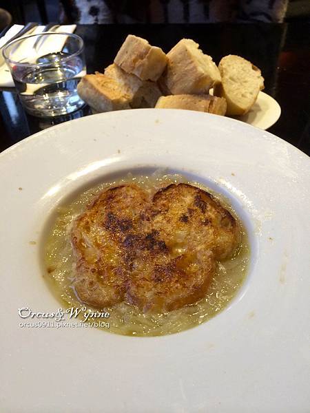 我點了個洋蔥湯,上面放了一大塊的法國麵包,那麵包吸滿了湯汁變得非常軟