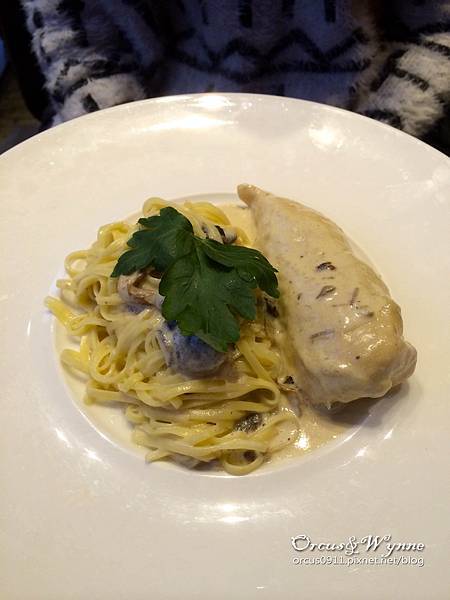 Wynne點的是奶油白醬雞胸義大利麵,它的麵條是細扁型的,整個巴住了醬汁的奶味