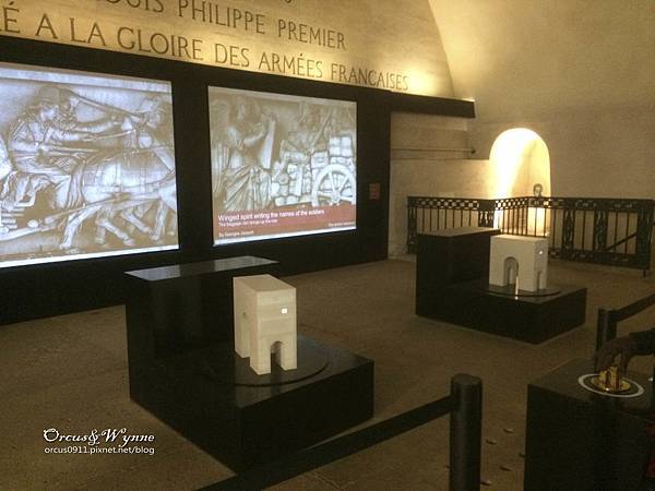 中間的白色凱旋門模型會顯示光點,代表著現在螢幕上放大的位置在哪,詳細著介紹在凱旋門各個角落上的浮雕作品,不過只有英文的啦!